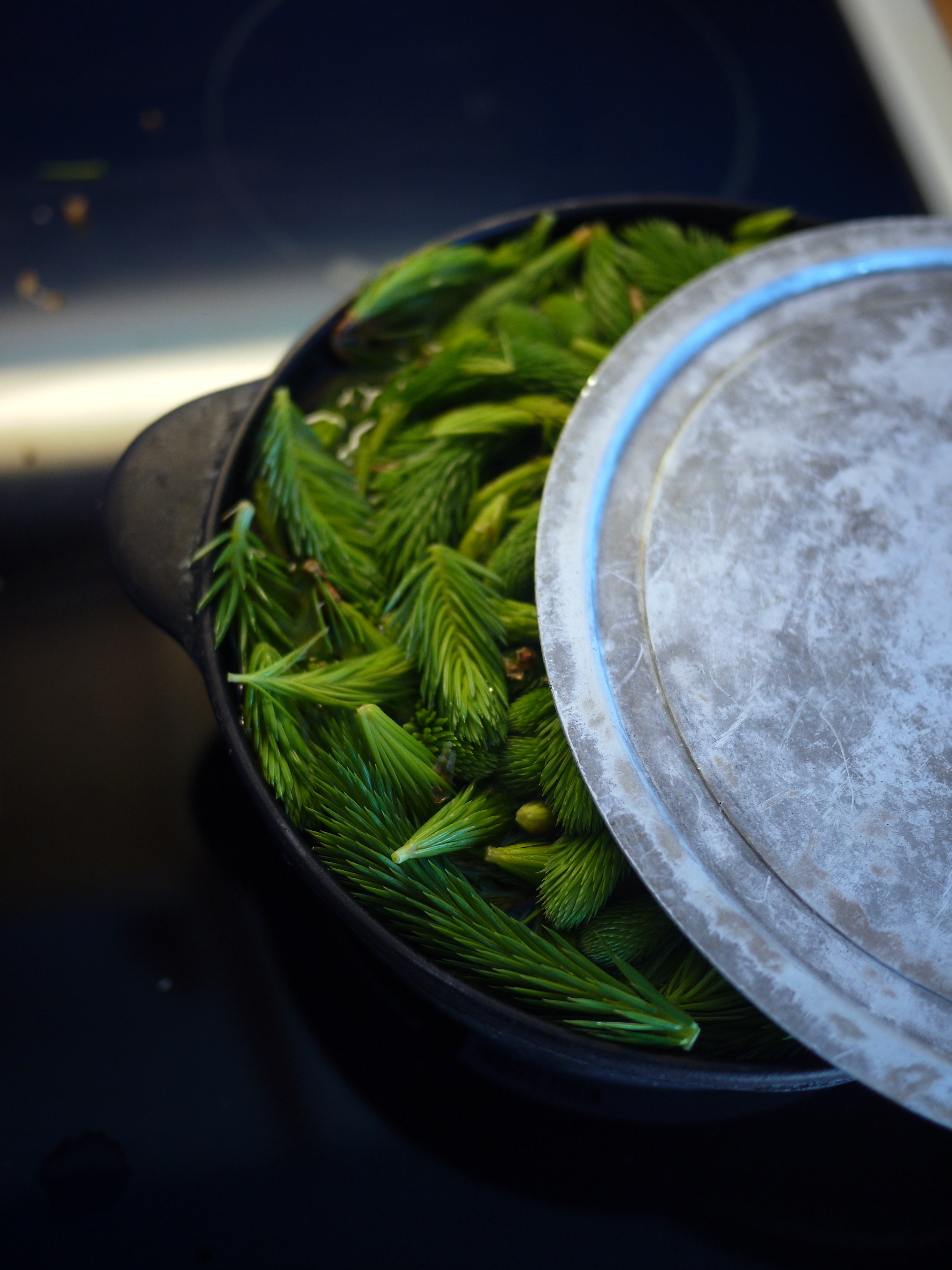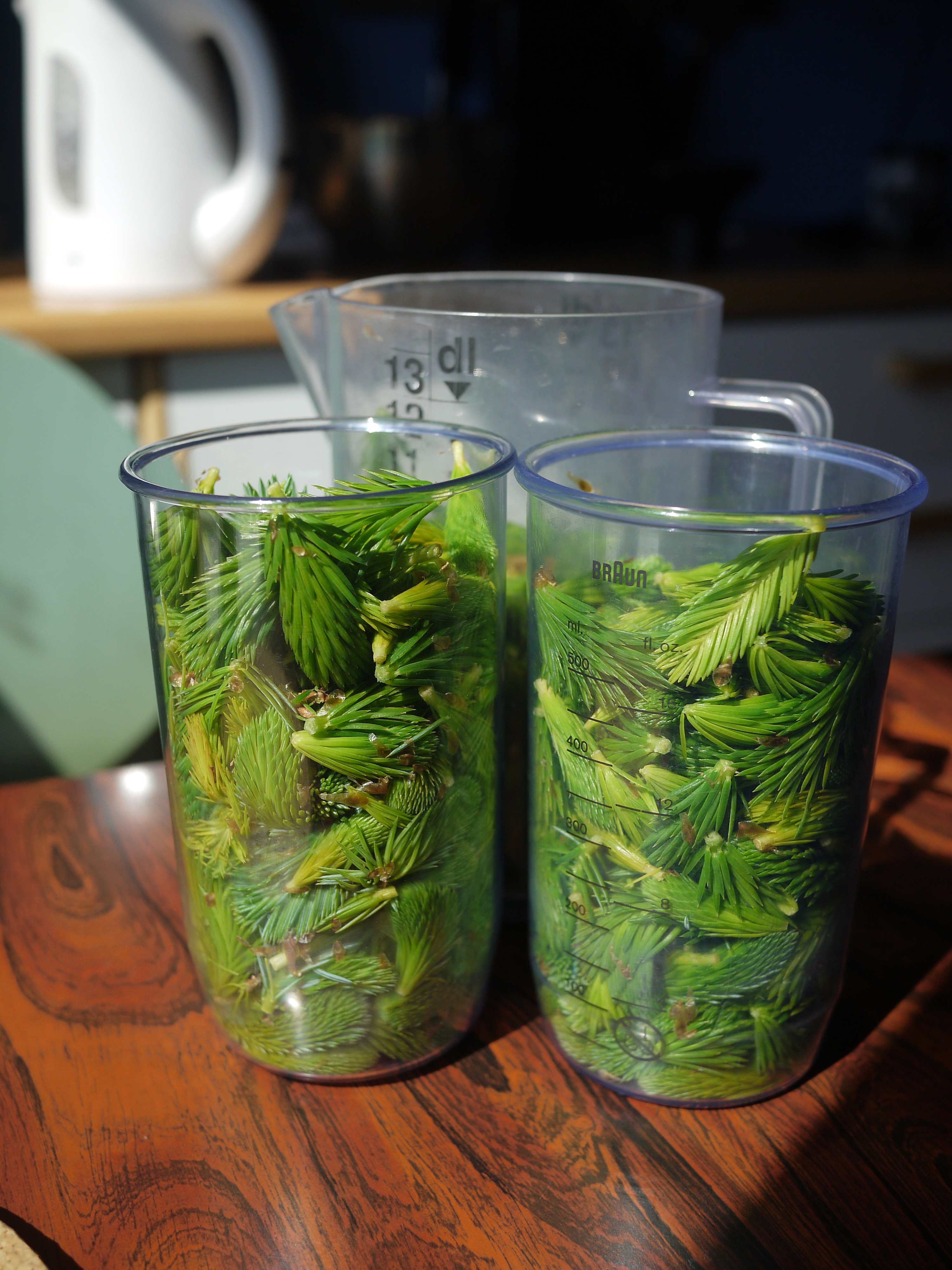 Plukk mjuke skudd frå gran (ca 1 liter) – det enklaste er å riva av med hendene.